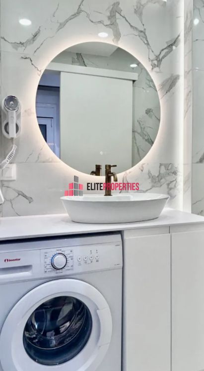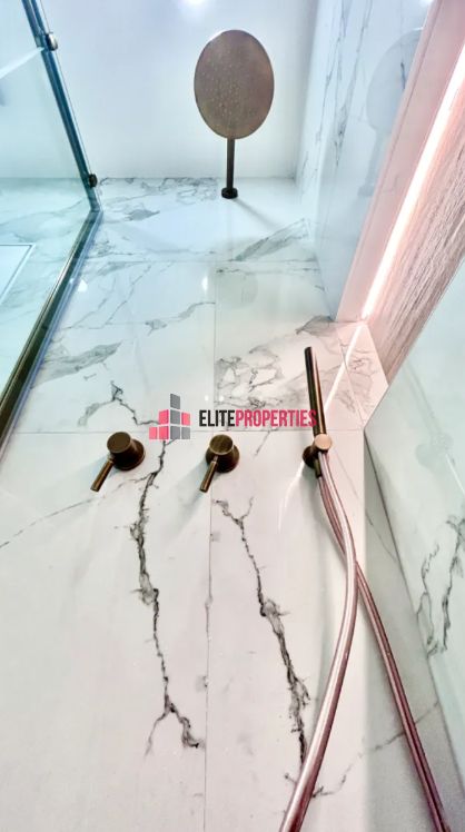超现代的豪华浴室配备淋浴、带内置水箱的洗手盆和带现代镜子的洗脸盆。浴室还配备洗衣机和吹风机。